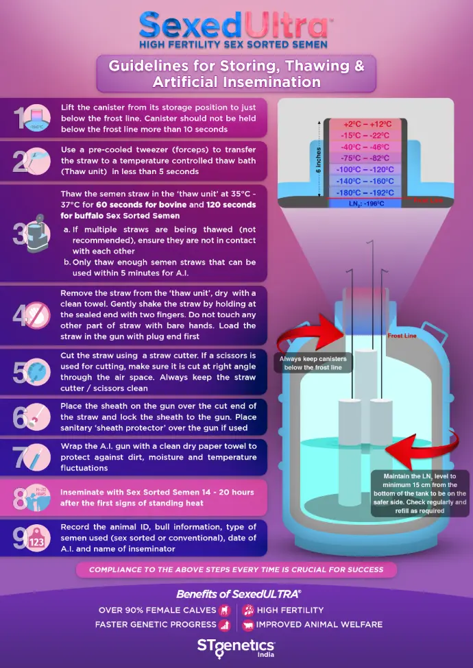 Proper handling of semen straws is critical for improving conception rates and achieving consistent fertility in dairy herds. Correct storage in liquid nitrogen, timely thawing at the right temperature, and careful preparation for artificial insemination ensure maximum viability of sperm cells. Following these guidelines minimizes wastage, reduces breeding costs, and improves overall herd productivity. Inseminating at the right time after detecting standing heat increases the chances of successful pregnancy. By adopting proper semen straw practices, farmers can achieve faster genetic progress, ensure healthier calves, and enhance profitability in dairy farming.